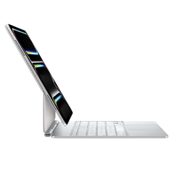 - iseño: Color Blanco; bisagra de aluminio flotante ajustable; reposamanos de aluminio; cubierta protectora frontal y trasera; peso 662 g; compatible exclusivamente con iPad Pro 13″ (M4/M5).
