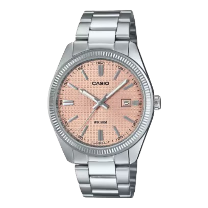 El Casio MTP-1302PE-4AVEF es un reloj analógico clásico y elegante de la colección Casio Timeless/Collection, con esfera en tono rosa salmón (salmon pink o pink dial) de efecto sunray o waffle, índices y agujas plateadas con recubrimiento luminiscente (Neobrite) para visibilidad en oscuridad. Su diseño sencillo en acero inoxidable con acabado ion plated, fecha a las 3 en punto y brazalete ajustable, lo hace ideal para uso diario, oficina o looks casuales/elegantes con un toque vibrante y original. Un modelo fiable, versátil y con excelente relación calidad-precio.